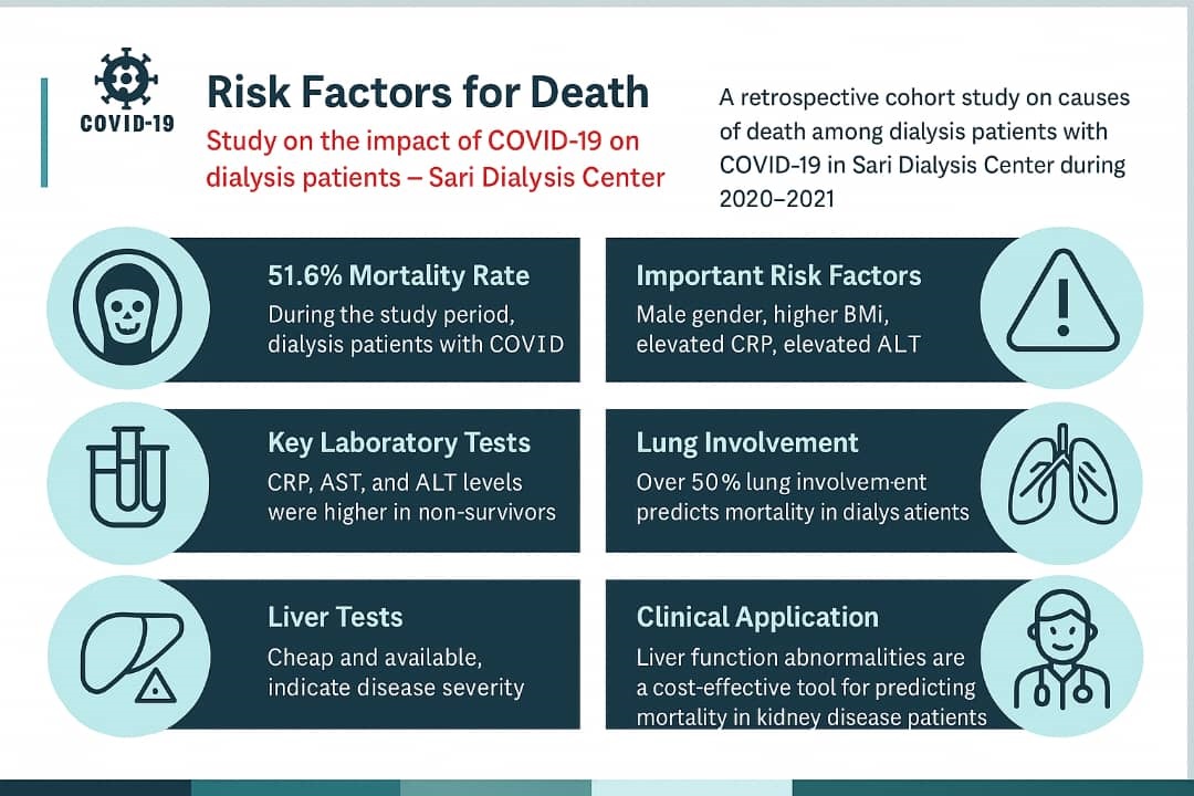 Conclusion: Considering that liver function tests are an integral part of routine biochemical investigations, are available in even the simplest laboratories in both urban and rural settings, and are relatively inexpensive and well standardized, abnormalities in liver function tests may serve as cost-effective markers of disease severity. These tests could therefore be valuable tools for family physicians, particularly at the community level, in assessing the severity of complications in patients with chronic kidney disease, especially hemodialysis patients affected by COVID-19.