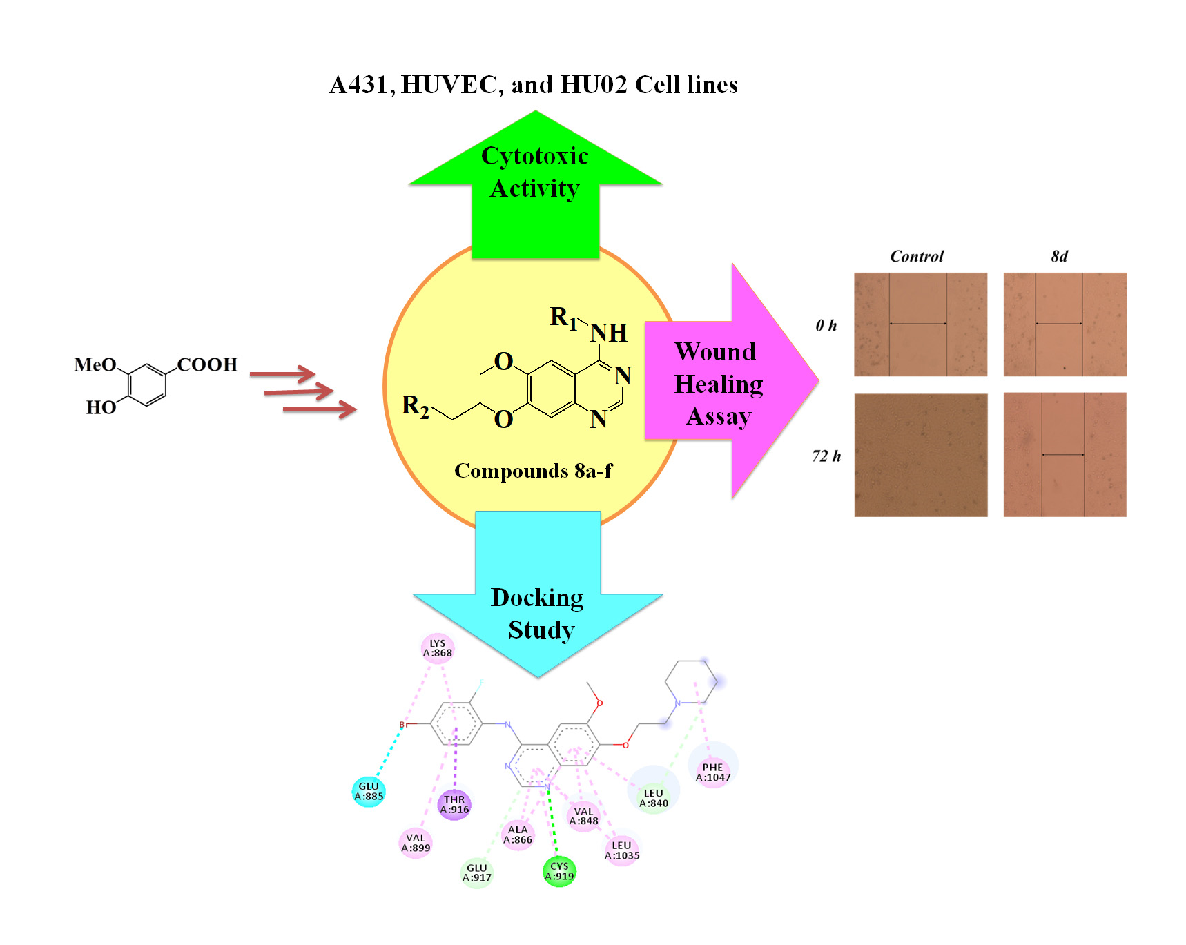 مواد و روش ها: در این مطالعه تجربی - آزمایشگاهی، مشتقات جدید 4-آنیلینوکینازولین حاوی گروههای پیپریدین و NوN-دی متیلآمین در موقعیت 7 حلقه کینازولین طراحی و سنتز شدند و فعالیت سیتوتوکسیک بر روی ردههای سلولی A431، HUVEC و HU02 مورد ارزیابی قرار گرفت. به منظور بررسی الگوی اتصال ترکیبات با بخش تیروزین کیناز EGFR وVEGFR-2، مطالعات داکینگ مولکولی انجام شد. در نهایت، سنجش ترمیم زخم به روش برونتن برای ارزیابی قدرت ترکیبات در مهار مهاجرت سلولی صورت پذیرفت.