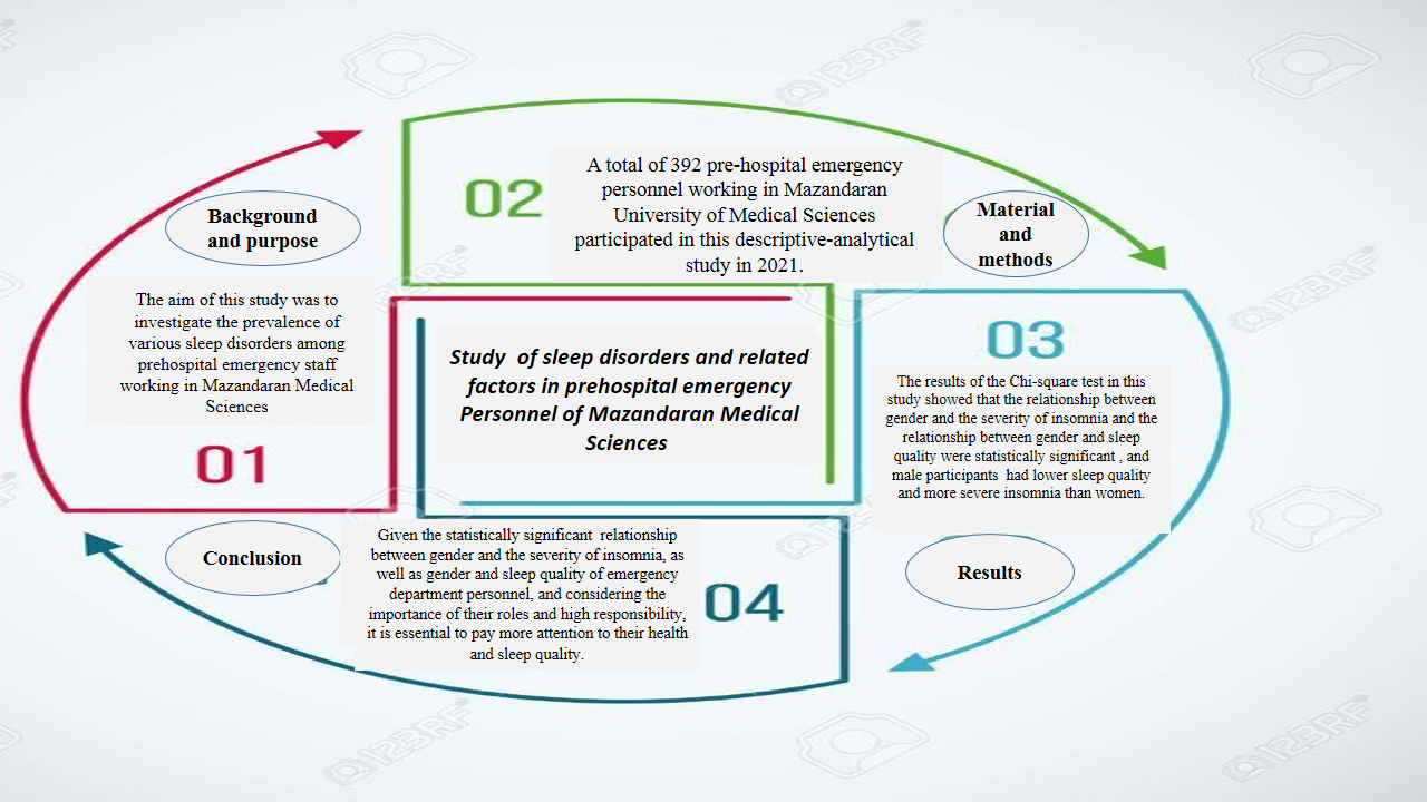 Materials and methods: The present descriptive-analytical study was conducted using a census approach among all personnel (staff and operational) of the pre-hospital emergency department of Mazandaran University of Medical Sciences in 2021. A total of 392 personnel participated in this study. To collect data, the Epworth Sleepiness Scale (ESS), Obstructive Apnea Risk Questionnaire (STOP-BANG) , Pittsburgh Sleep Quality Index Questionnaire (PSQI), Insomnia Severity Index (ISI), and Restless Legs Severity Severity Scale (RLS) were used descriptive and inferential statistics such as Pearson's chi-square test were used to analyze the data.