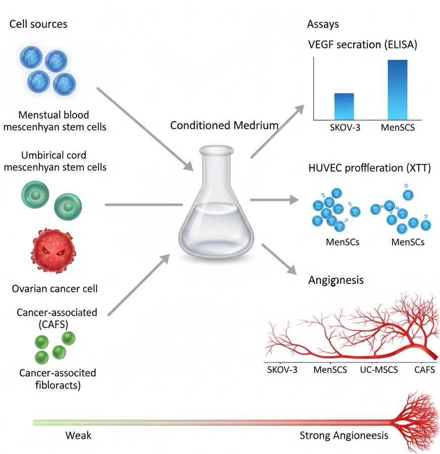 Background and purpose: Regenerative medicine focuses on replacing dysfunctional cells with mesenchymal stem cells (MSCs) to repair damaged tissues. However, genomic instability and the potential risk of tumor formation remain significant challenges in the use of these cells. Cell-free therapies, such as those based on conditioned media (CM), have emerged as promising alternatives due to their role in promoting angiogenesis. Since malignant solid tumors exhibit the most robust angiogenic activity, this study aimed to compare the angiogenic potential of CM derived from menstrual blood-derived MSCs (MenSCs), umbilical cord-derived MSCs (UC-MSCs), ovarian cancer cells (SKOV-3), and cancer-associated fibroblasts (CAFs).