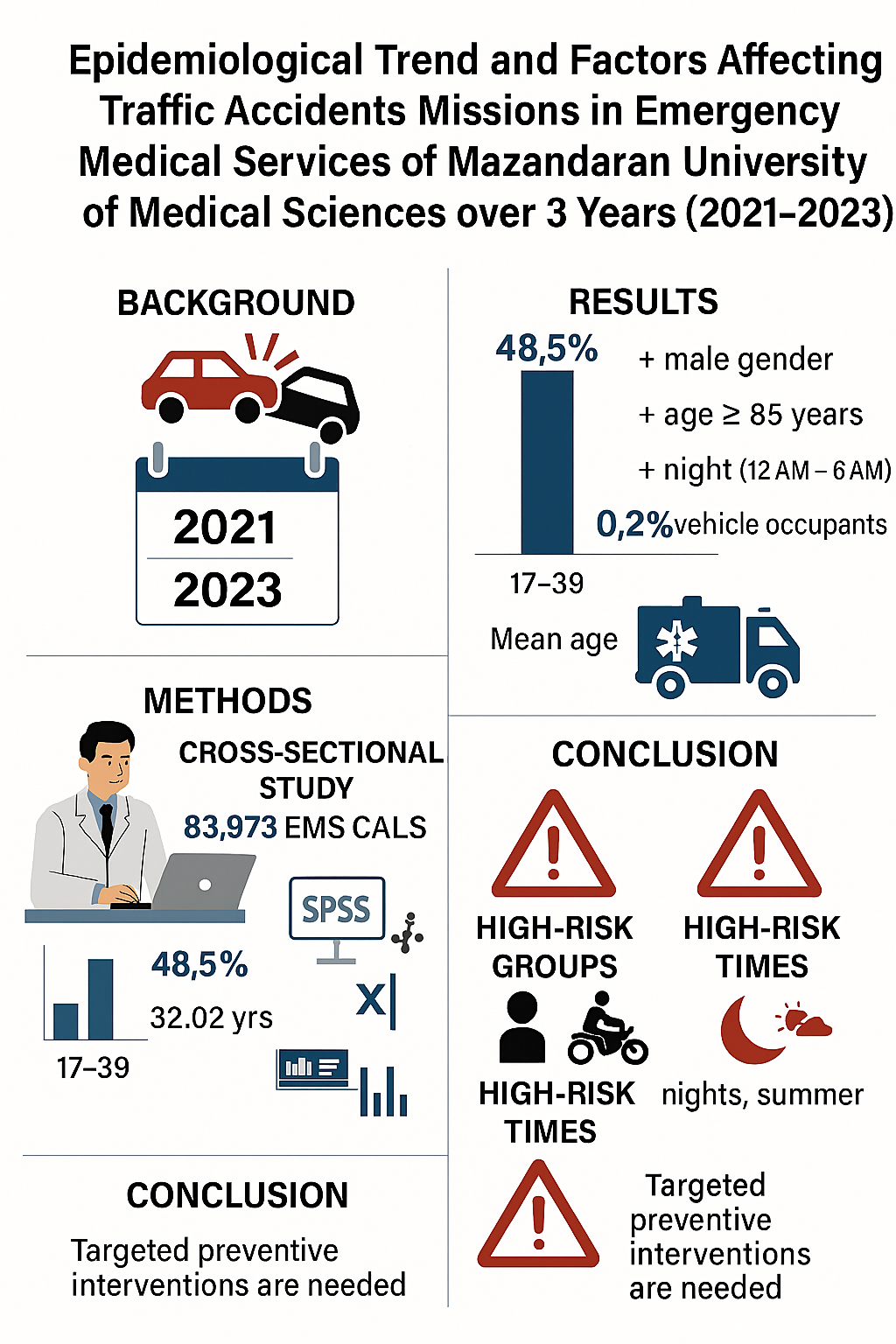 Salehtabari Y, khonakdar K, Fendereski A, Talebi Ghadicolaei H, Bozorgi F, Yaghubi T, et al . Epidemiological Trend and Factors Affecting Traffic Accidents Missions in Emergency Medical Services of Mazandaran University of Medical Sciences over 3 Years (2021-2024). J Mazandaran Univ Med Sci 2025; 35 (250) :163-173