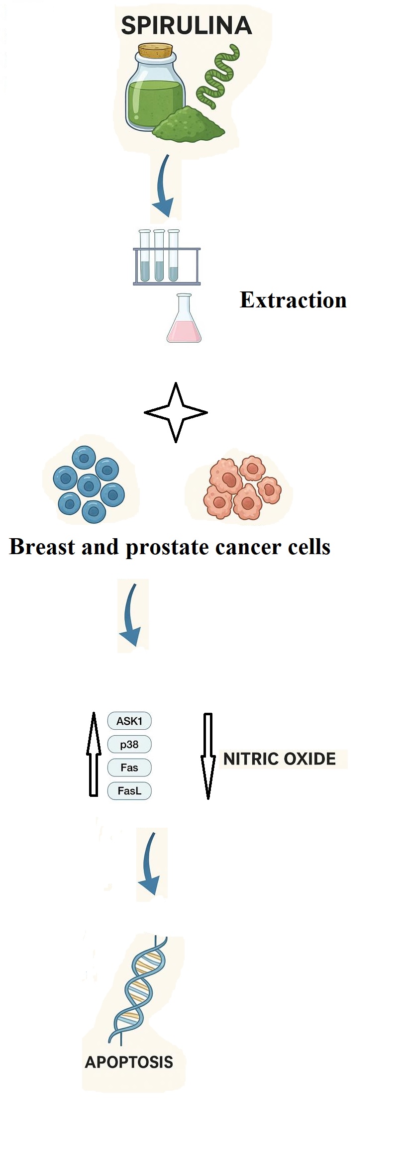 Faramarzi A, Pazhouhi M, Ali Mohammad A, Jalili C. Effects of Spirulina Extract on Proliferation, Apoptosis, Nitric Oxide Production, and Activation of the Fas/FasL–ASK1–p38 Pathway in Breast and Prostate Cancer Cells. J Mazandaran Univ Med Sci 2025; 35 (249) :20-31