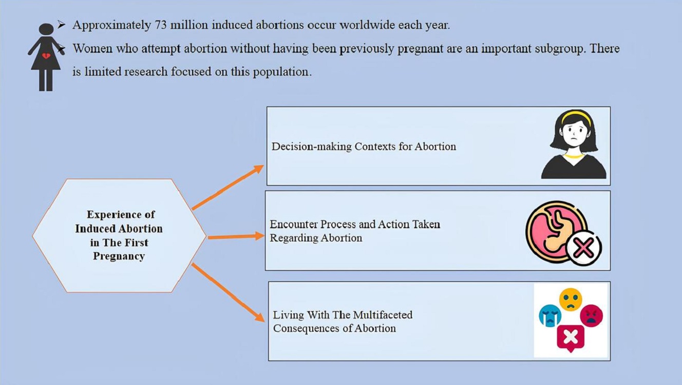 Results: Out of the initial codes, a total of 385 final codes were obtained. Three main categories emerged: “Decision-making contexts for abortion,” “Encounter process and actions taken regarding abortion,” and “Living with the multifaceted consequences of abortion.” These categories comprised three, four, and two subcategories, respectively. The category “Decision-making contexts for abortion” included subcategories such as idealism in achieving personal goals, insufficient reproductive health literacy, and the normalization of abortion within social networks. The category “Encounter process and actions taken regarding abortion” comprised subcategories such as denial and delay in accepting pregnancy, urgency in decision-making, and concealment and social isolation. The category “Living with the multifaceted consequences of abortion” encompassed subcategories such as experiencing physical complications and psychological and emotional distress.