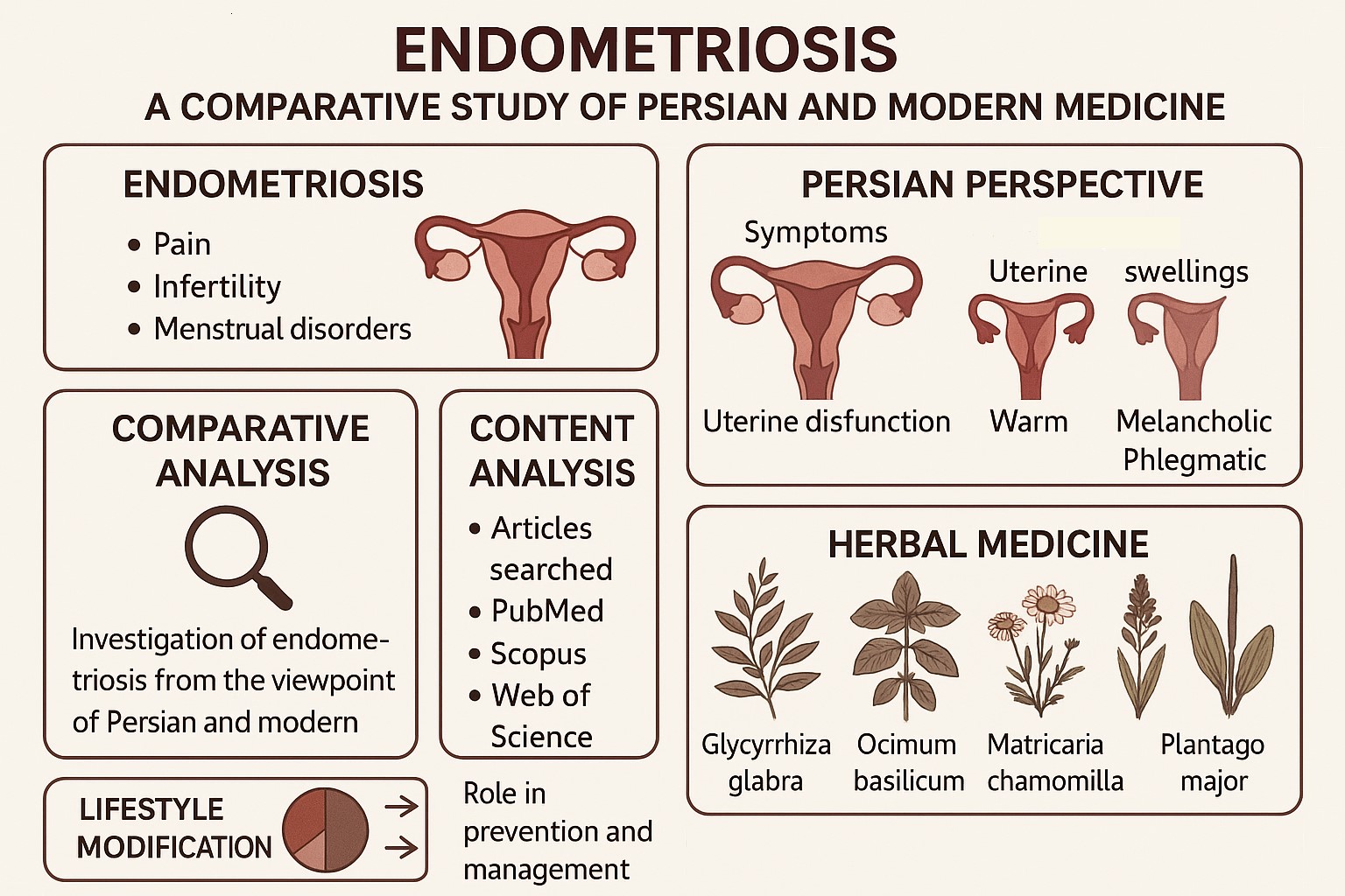 سابقه و هدف:اندومتریوز یک اختلال شایع زنان می باشد که با رشد بافت آندومتر در خارج از رحم مشخص می شود. بهدلیل ناکافی بودن درمان های جدید، امروزه استفاده از طب مکمل روند رو به فزاینده ای دارد. هدف این مطالعه بررسی تطبیقی اندومتریوز از دیدگاه طب ایرانی و طب نوین می باشد تا با شناخت بهتر این بیماری بتوان مدیریت تلفیقی موثرتری برای بیماران فراهم نمود.این پژوهش یک مرور روایتی است که با هدف بررسی علائم، اتیولوژی، پاتوفیزیولوژی و درمان بیماری اندومتریوز از دیدگاه طب ایرانی و نوین انجام شده است. بدین منظور جستجوی مقالات در پایگاههای اطلاعاتی اصلی و مطالعه منابع معتبر طب ایرانی بر اساس کلید واژه های مربوطه انجام شد. داده های استخراج شده بعد از طبقه بندی، مورد تطبیق و تناظریابی قرار گرفت. درد، ناباروری و اختلالات قاعدگی شایع ترین علائم اندومتریوز می باشد که در طب ایرانی در زمینه اختلالات عملکرد رحمی مانند سوء مزاج ها یا انواع مختلف ورم رحم از جمله گرم، سوداوی یا بلغمی می تواند بروز پیدا کند. بررسی فاکتورهای خطر و محافظتی در اندومتریوز نشان می دهد اصلاح سبک زندگی نقش موثری در پیشگیری و درمان این بیماری دارد.گیاهان دارویی متعددی در منابع طب ایرانی برای درمان انواع ورم های رحم با توجه به اتیولوژی آن مطرح شده است. مطالعات جدید اثرات آنتی اکسیدانی، ضد التهابی، اثرات ضد رگ زایی و مهار تکثیر و مهاجرت سلولهای اندومتریوز را در بررسی گیاهان دارویی در اندومتریوز نشان داده است.با بررسی علائم و عوارض اندومتریوز و تطبیق آن ها در منابع طب ایرانی به نظر می رسد طیفی ازاختلالات با محوریت سوء مزاج ها و ورم ها با منشأ رحمی بیشترین تناظر را با اندومتریوز داشته باشد. مطالعات بیشتر جهت بررسی رویکردهای تلفیقی در جنبه های تشخیصی و درمانی پیشنهاد می شود.