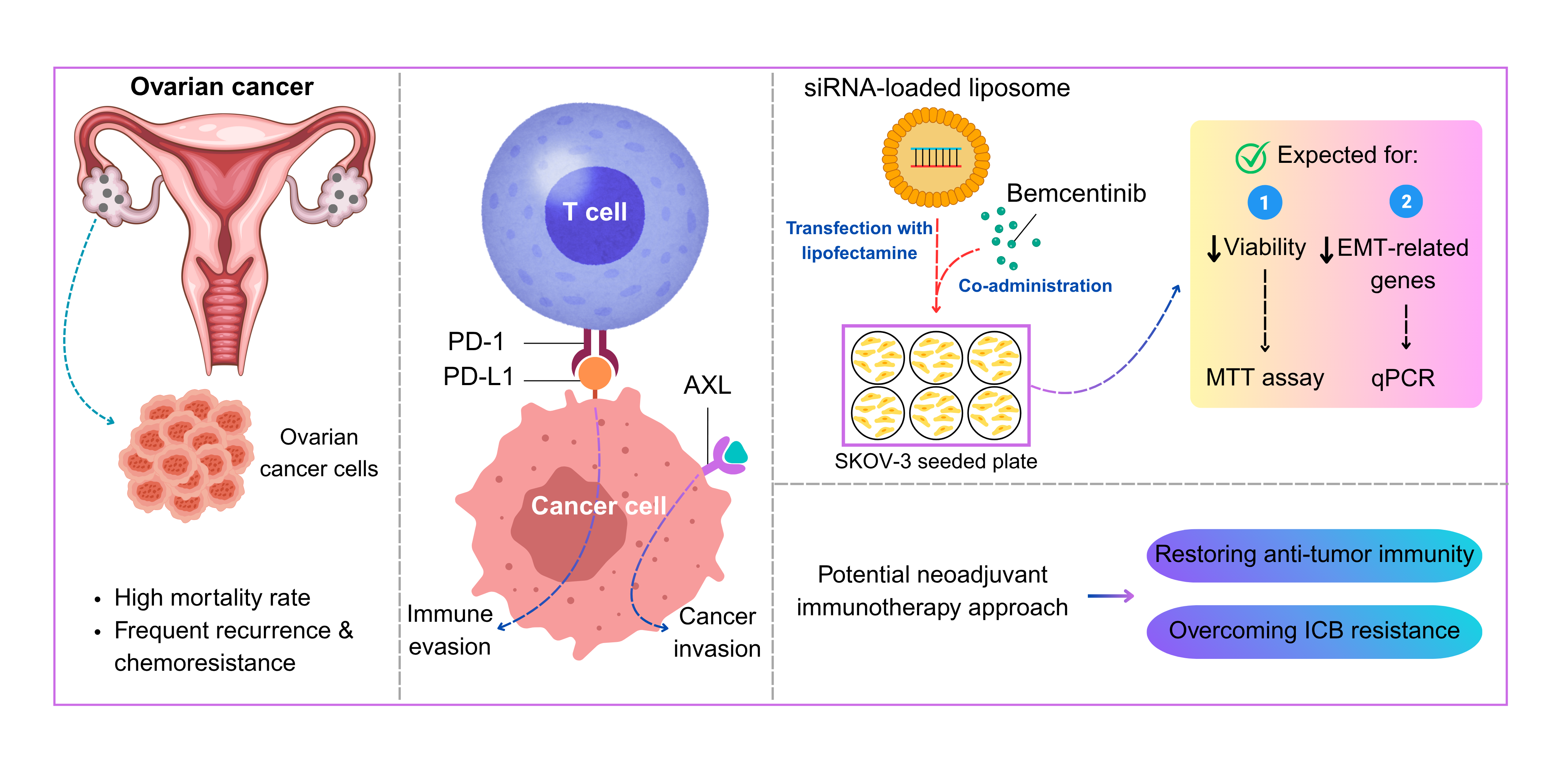 استنتاج: استراتژی مهار همزمان مسیرهای PD-L1 و AXL میتواند به عنوان یک رویکرد درمانی نوید بخش در مدیریت سرطان تخمدان مقاوم به درمان مطرح باشد. با این حال، مطالعات تکمیلی در مدلهای پیش بالینی و ارزیابیهای ایمونولوژیک گستردهتر ضروری به نظر میرسد.
