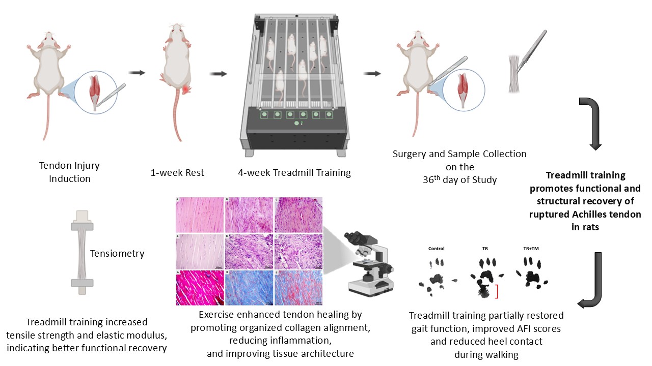 Results: Treadmill training initiated after the inflammatory phase led to notable improvements in tendon repair. The Achilles Functional Index (AFI) was significantly higher in the treadmill group than in the tendon injury group (P< 0.05). Footprint analysis demonstrated that the tendon injury + treadmill group’s gait profile closely resembled that of the uninjured control group. Histological examination showed disorganized collagen fibers, inflammatory infiltration, and increased cell density in the injury group, whereas the treadmill-trained group displayed more organized collagen alignment, reduced inflammation, and lower cellular density. Biomechanical (tensiometric) testing confirmed superior mechanical strength and recovery in the tendon injury + treadmill group compared with the tendon injury group.