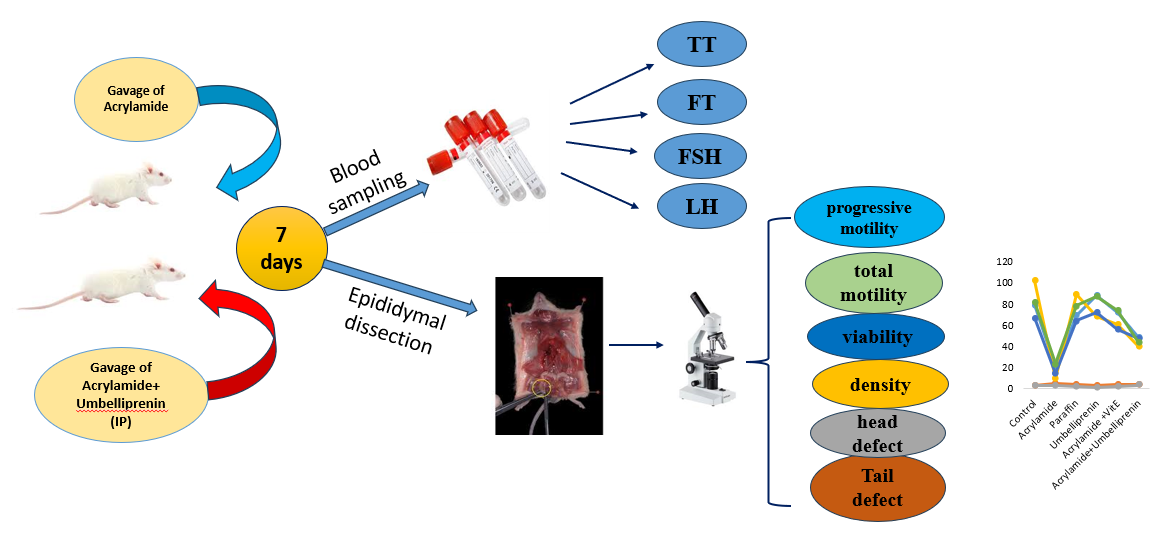 Results: Acrylamide significantly reduced the levels of TT, FT, FSH, and LH, as well as sperm parameters including total motility, progressive motility, concentration, and viability. The increase in sperm structural abnormalities was not statistically significant. Umbelliprenin treatment resulted in a significant increase in TT and FT levels, although these values did not return to normal levels. Sperm viability, total motility, and progressive motility showed significant improvement compared to the acrylamide group but remained lower than those of the control group. Notably, treatment with vitamin E restored TT and FT levels to values close to normal and also improved sperm parameters, particularly motility, concentration, and viability. The paraffin and umbelliprenin groups showed no significant changes compared with the control group. None of the treatments modulated the effects of acrylamide on FSH and LH levels.